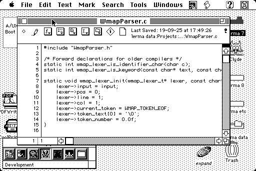 . It handles unix and macintosh line endings seamlessly, and I can trigger THINK C commands and reference directly from the editor.
